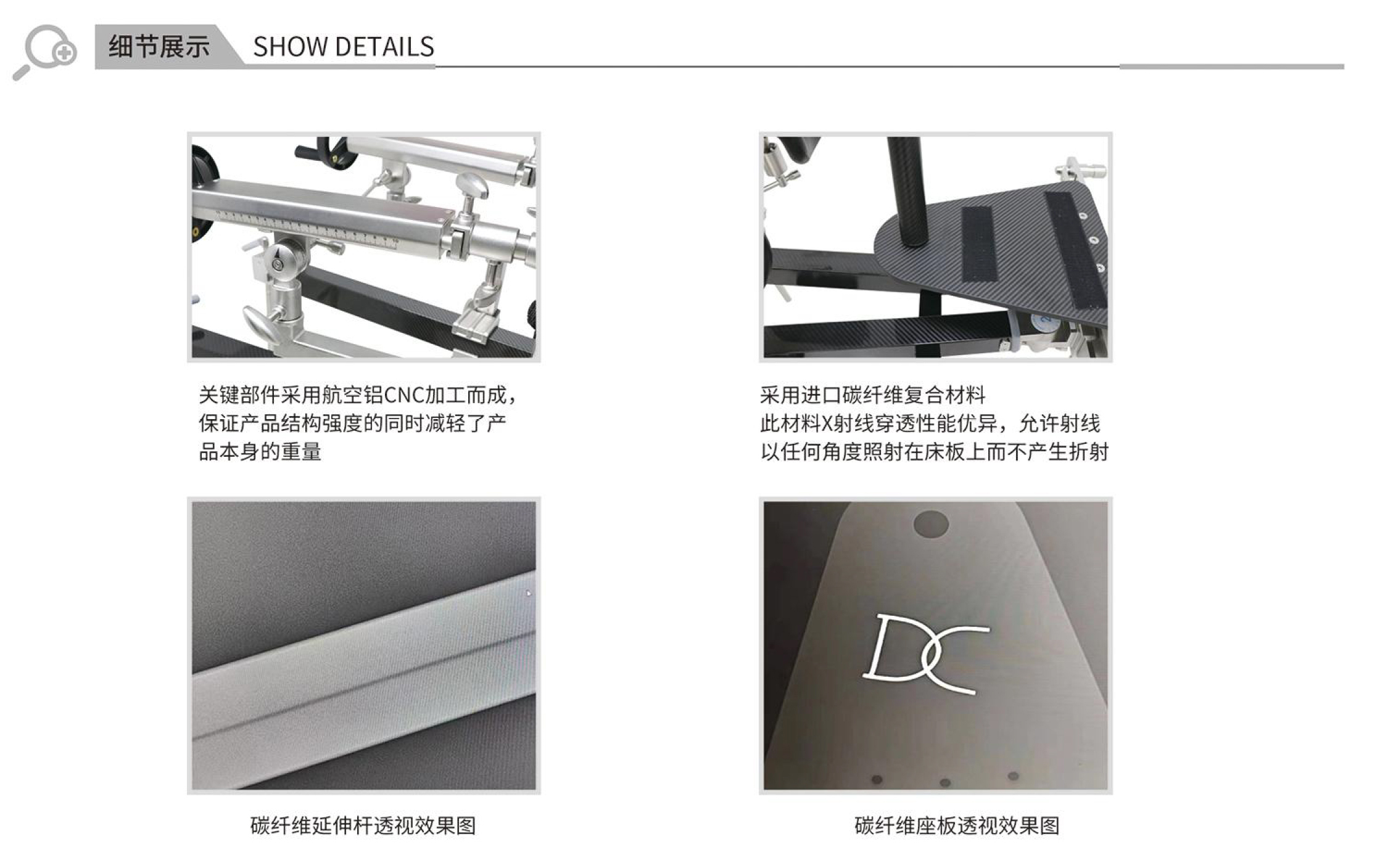 (2)優(yōu)異的X射線透過性:碳纖維材料對X射線具有極好的透過性,這意味著在手術(shù)過程中,醫(yī)生可以清晰地通過X射線進行透視和檢查,而不受牽引架的干擾。這對于確保手術(shù)的精確性和安全性至關(guān)重要。